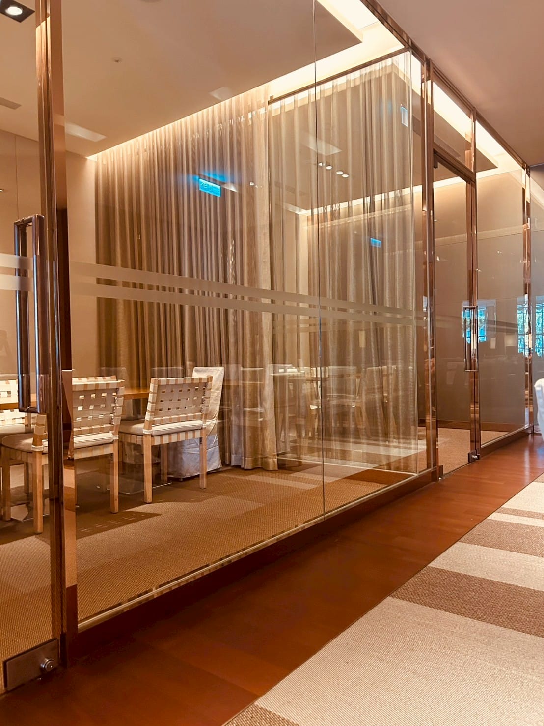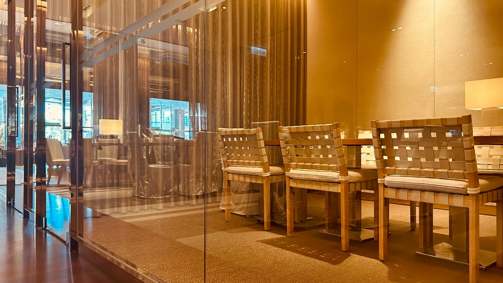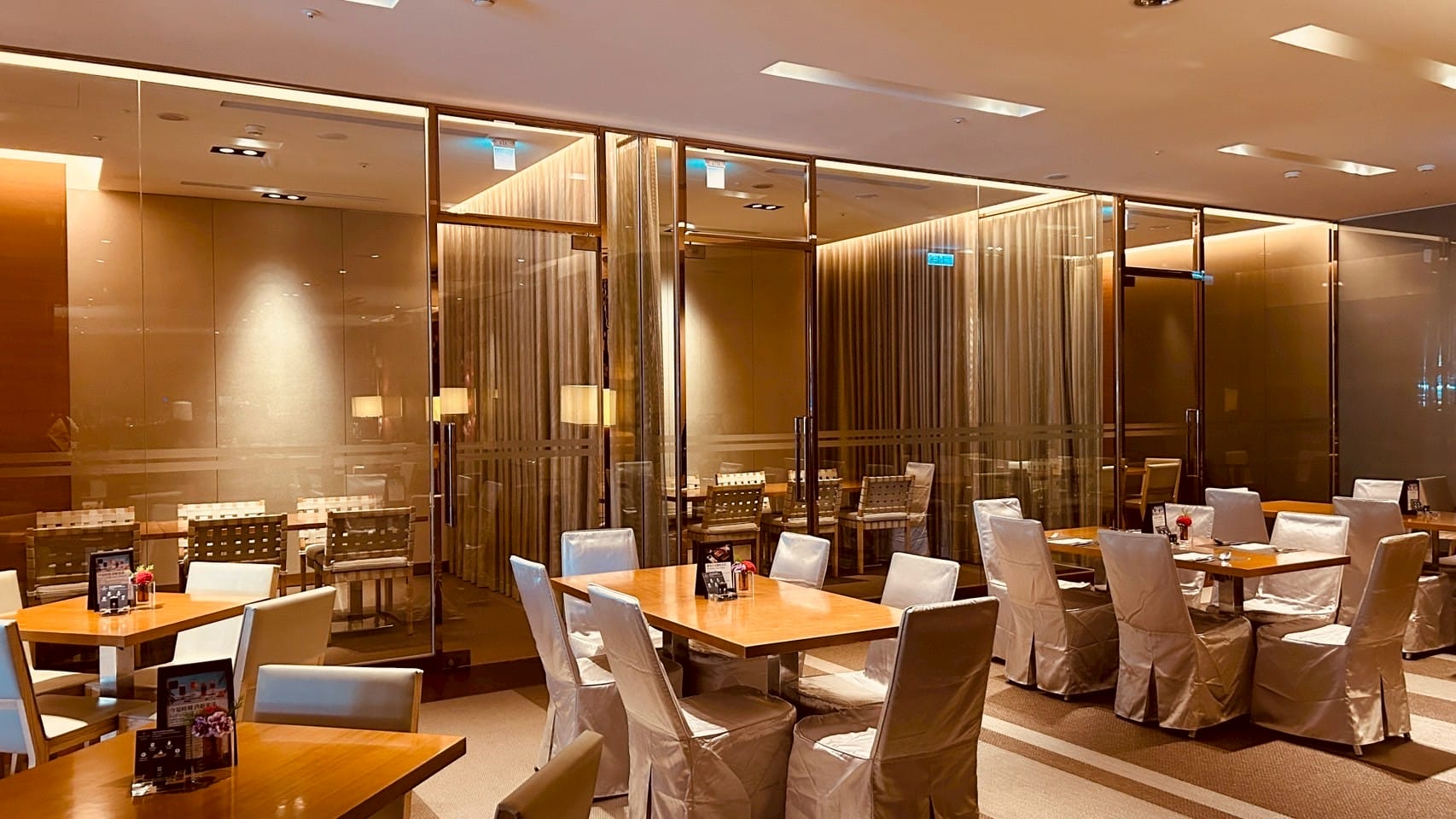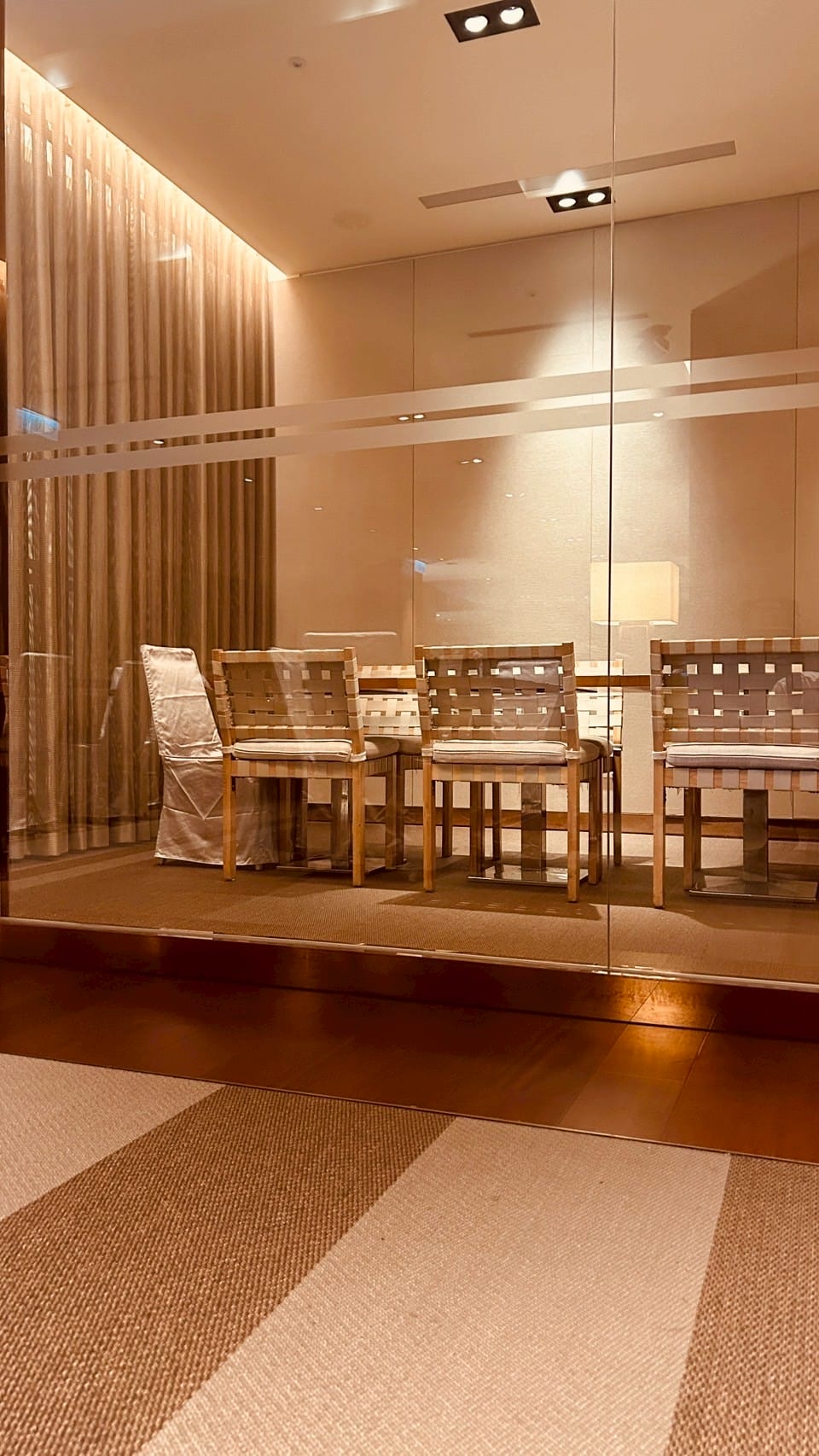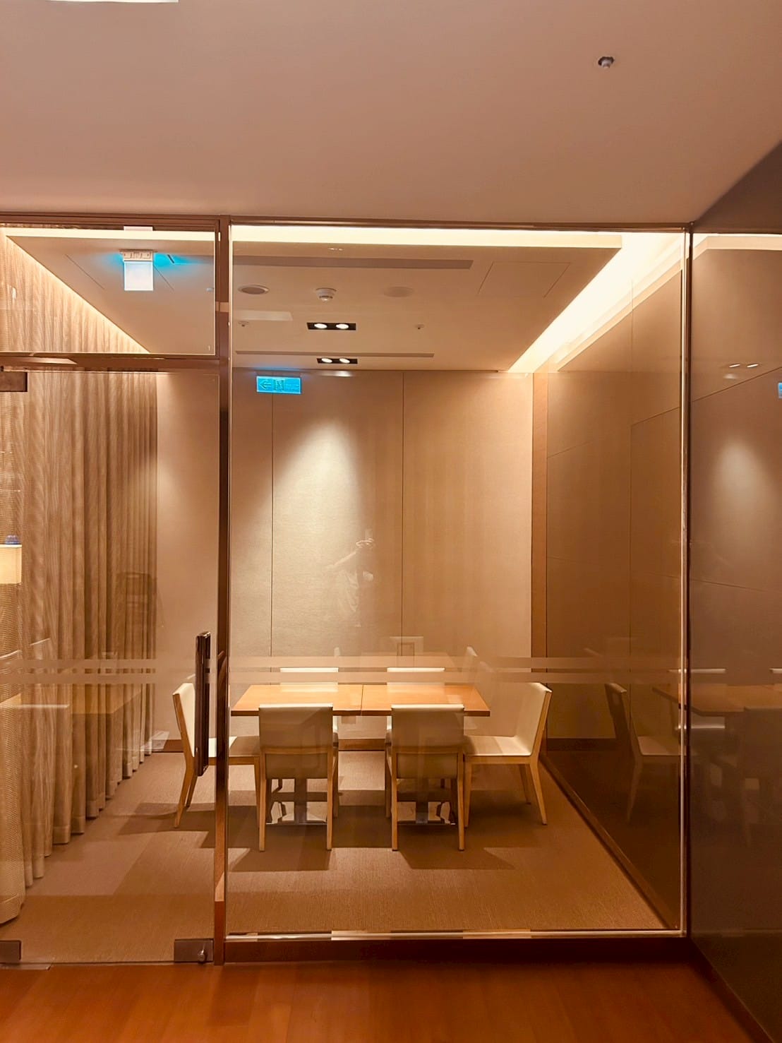 落地玻璃搭配著微量的金屬元素,跟著計算好距離的射燈,打在一桌又一桌的餐桌上,整體設計以溫暖的木質色調與柔和的燈光為主,營造出高雅放鬆的氛圍。並讓佳餚更顯美味。享受舒適溫馨的用餐空間。以大片透明玻璃隔間區分出獨立包廂,玻璃搭配隱約可見的布簾,兼顧隱私與開放感。包廂內有更小的方桌與編織感的椅子,適合小型聚餐或會議。整個空間的燈光設計以間接照明和落地燈為主,帶來柔和的光暈,不刺眼,讓人感覺舒適放鬆。