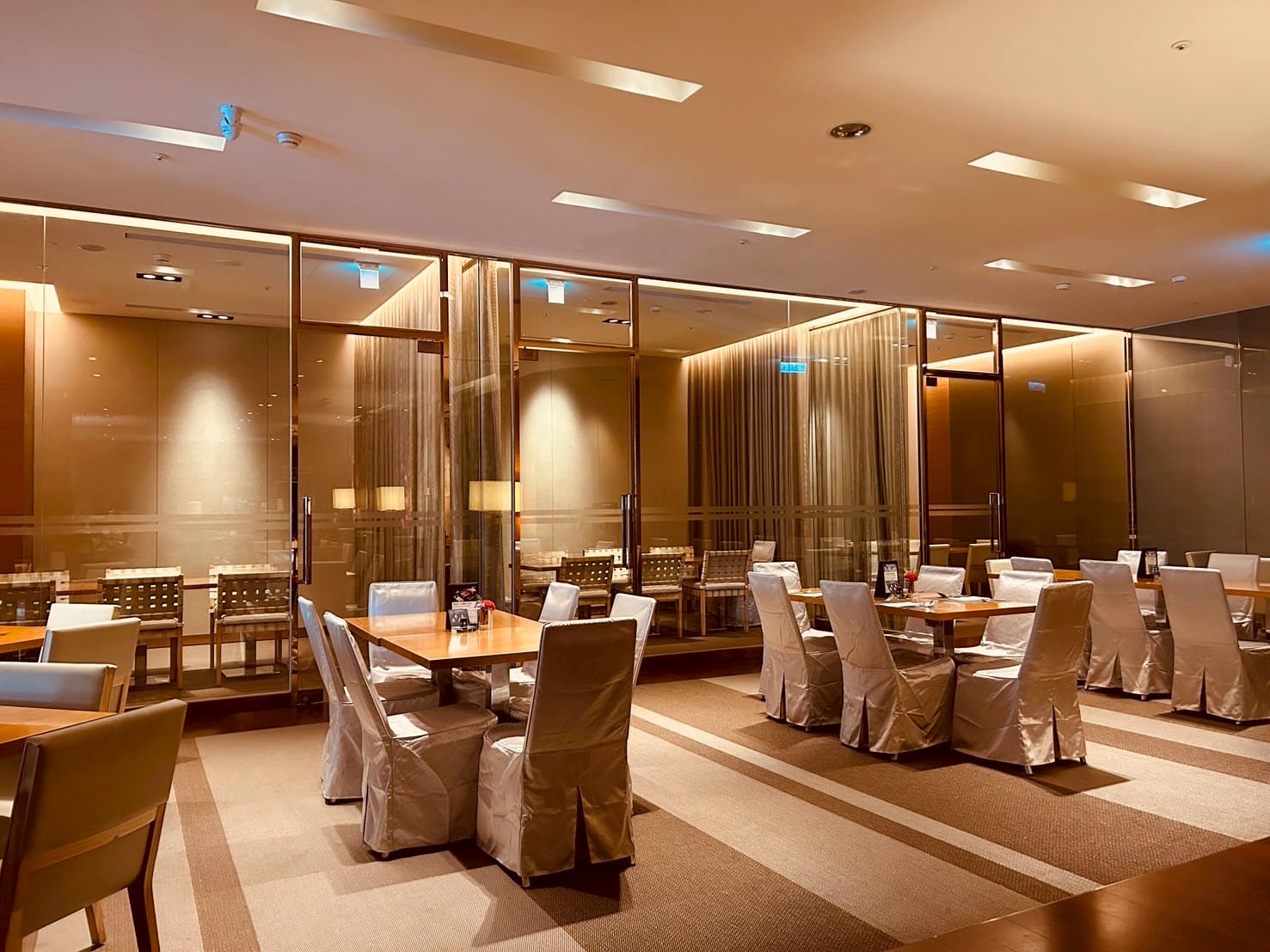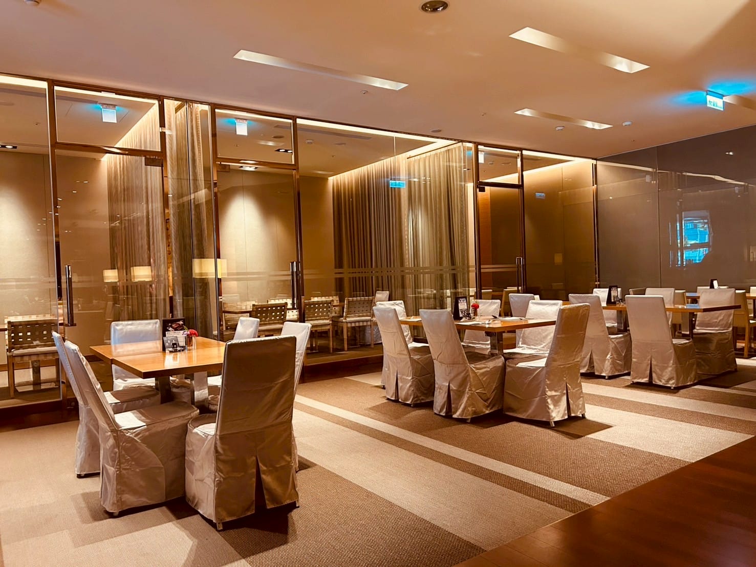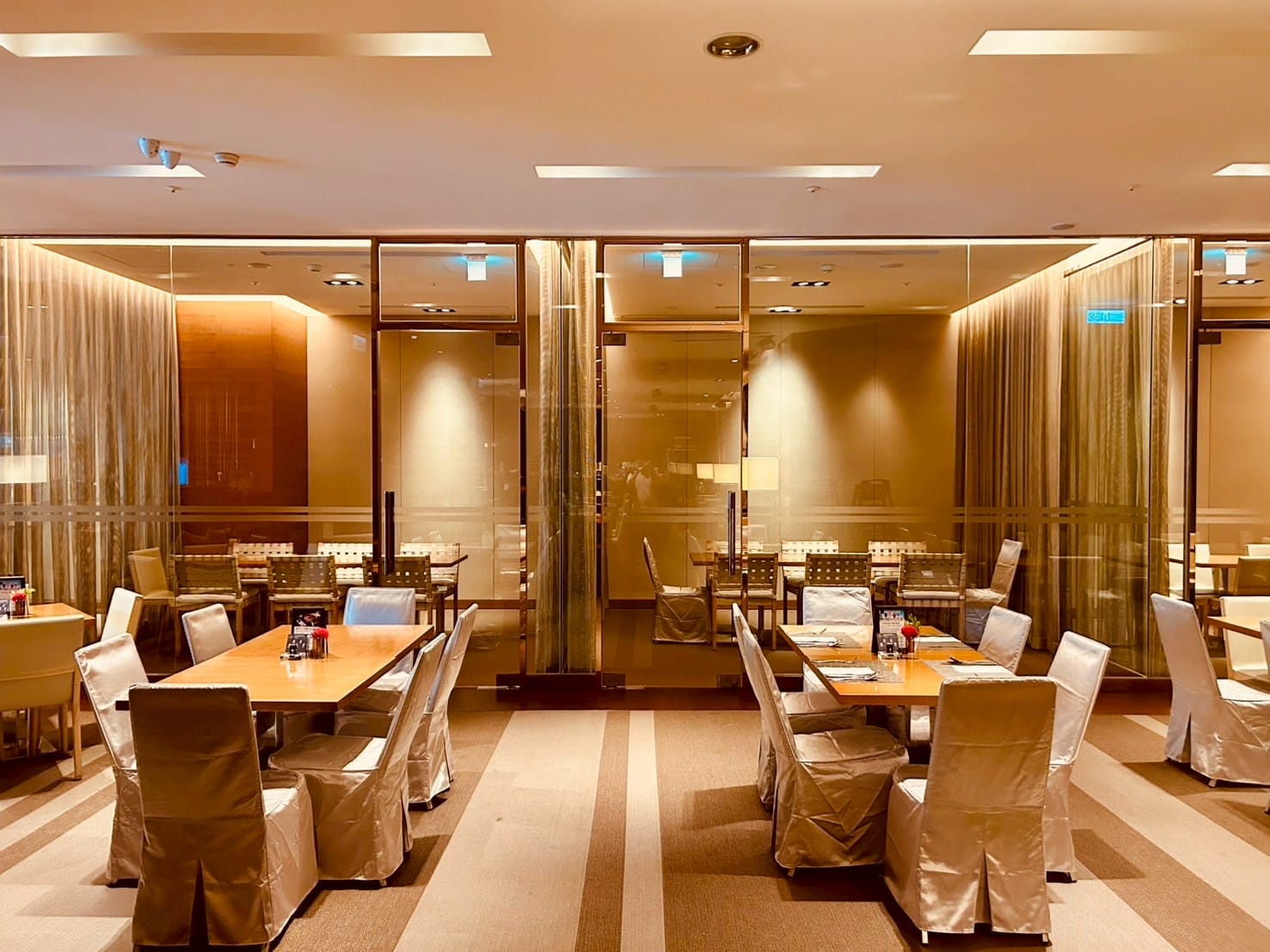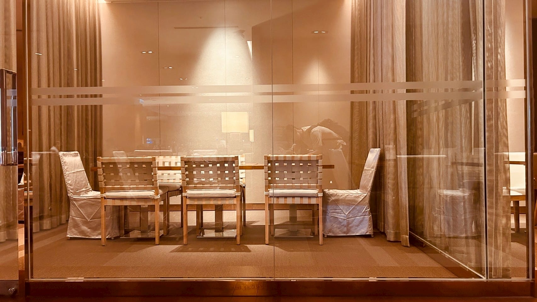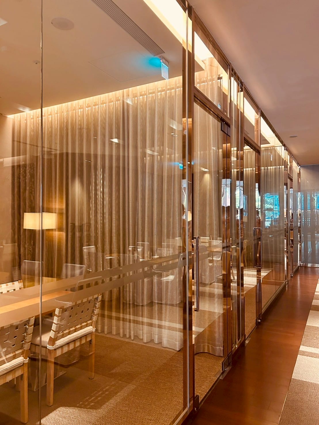 落地玻璃搭配著微量的金屬元素,跟著計算好距離的射燈,打在一桌又一桌的餐桌上,整體設計以溫暖的木質色調與柔和的燈光為主,營造出高雅放鬆的氛圍。並讓佳餚更顯美味。享受舒適溫馨的用餐空間。以大片透明玻璃隔間區分出獨立包廂,玻璃搭配隱約可見的布簾,兼顧隱私與開放感。包廂內有更小的方桌與編織感的椅子,適合小型聚餐或會議。整個空間的燈光設計以間接照明和落地燈為主,帶來柔和的光暈,不刺眼,讓人感覺舒適放鬆。