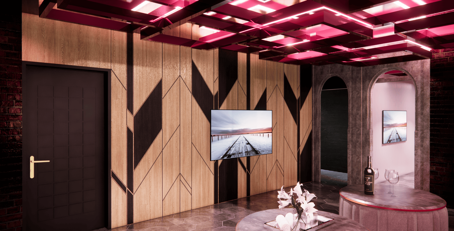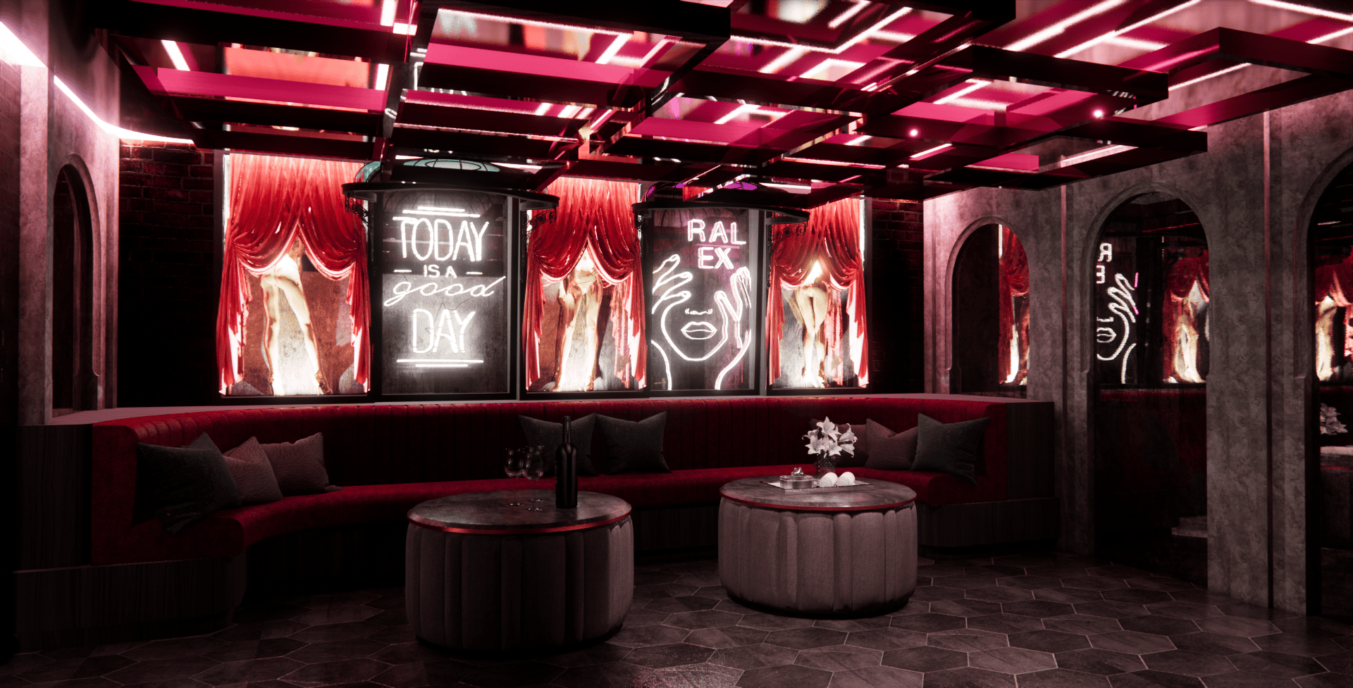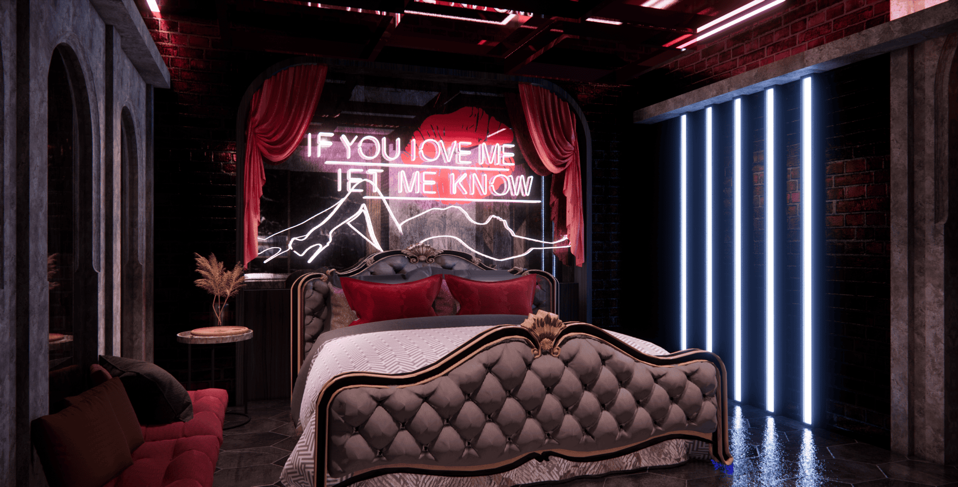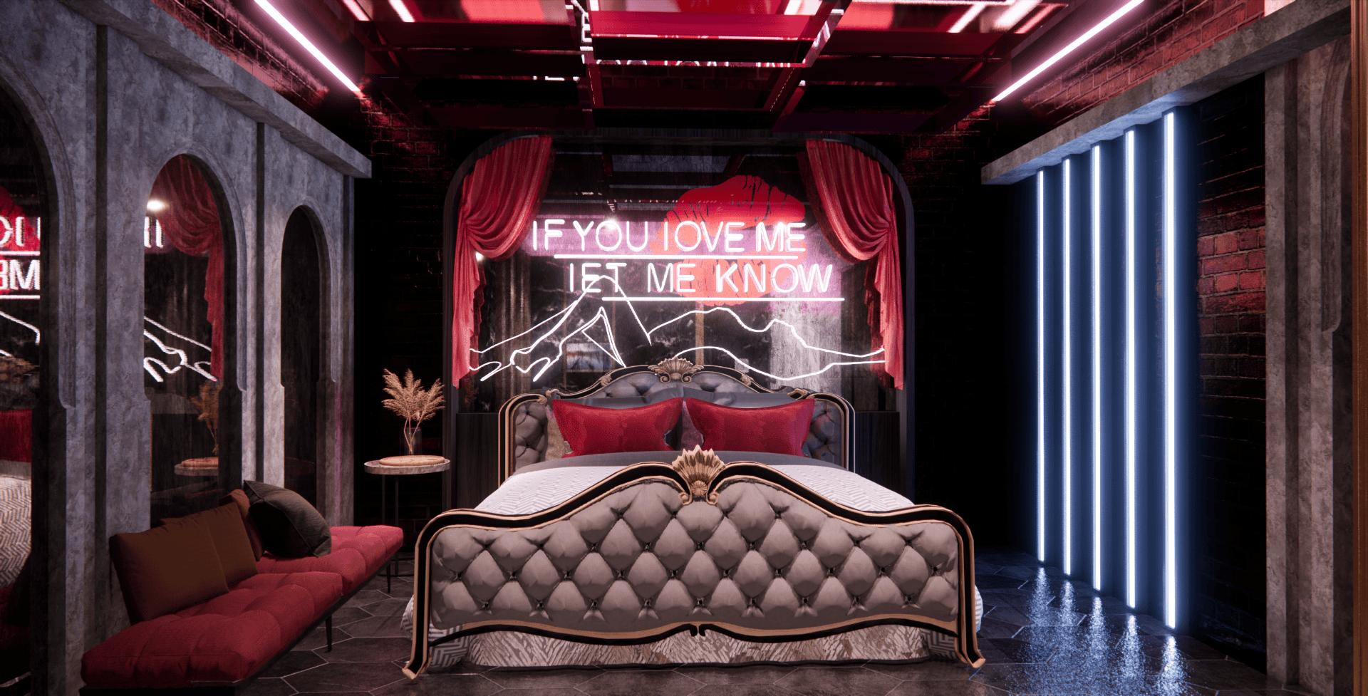 窺見慾望的秘密,盡在此間——這座KTV旅館以情慾釋放為靈感,空間猶如火焰般熱情躍動的佛朗明哥舞曲,誘惑藏於輕柔帷幕之下,若隱若現。鮮紅象徵炙熱渴望,酒紅承載醉人的浪漫與纏綿,邀您探索簾布深處最真實的慾望世界。步入神秘閨房,巴洛克式雕花的床緣低語著新戲的序章。紅藍交織的燈光幻化成醉夢迷離的境界,霓虹燈映襯著女性曲線與字體,讓肢體語言化為紳士之外最深情的表白。激情過後,靜謐的休憩空間由黑色馬賽克磁磚與金色邊條精緻點綴,營造出高雅且幽深的氛圍,成就每一次情感釋放後的完美沉澱。除此之外,旅館設有寬敞奢華的KTV包廂,結合現代音響設備與質感裝潢,讓您與摯愛或摯友在歌聲與低語中放鬆身心,歡聚共鳴,創造值得珍藏的美好時刻。在這裡,情慾與歡樂交織,時間猶如佳釀般細細醞釀,讓每一刻皆成為帷幕之下的延伸。