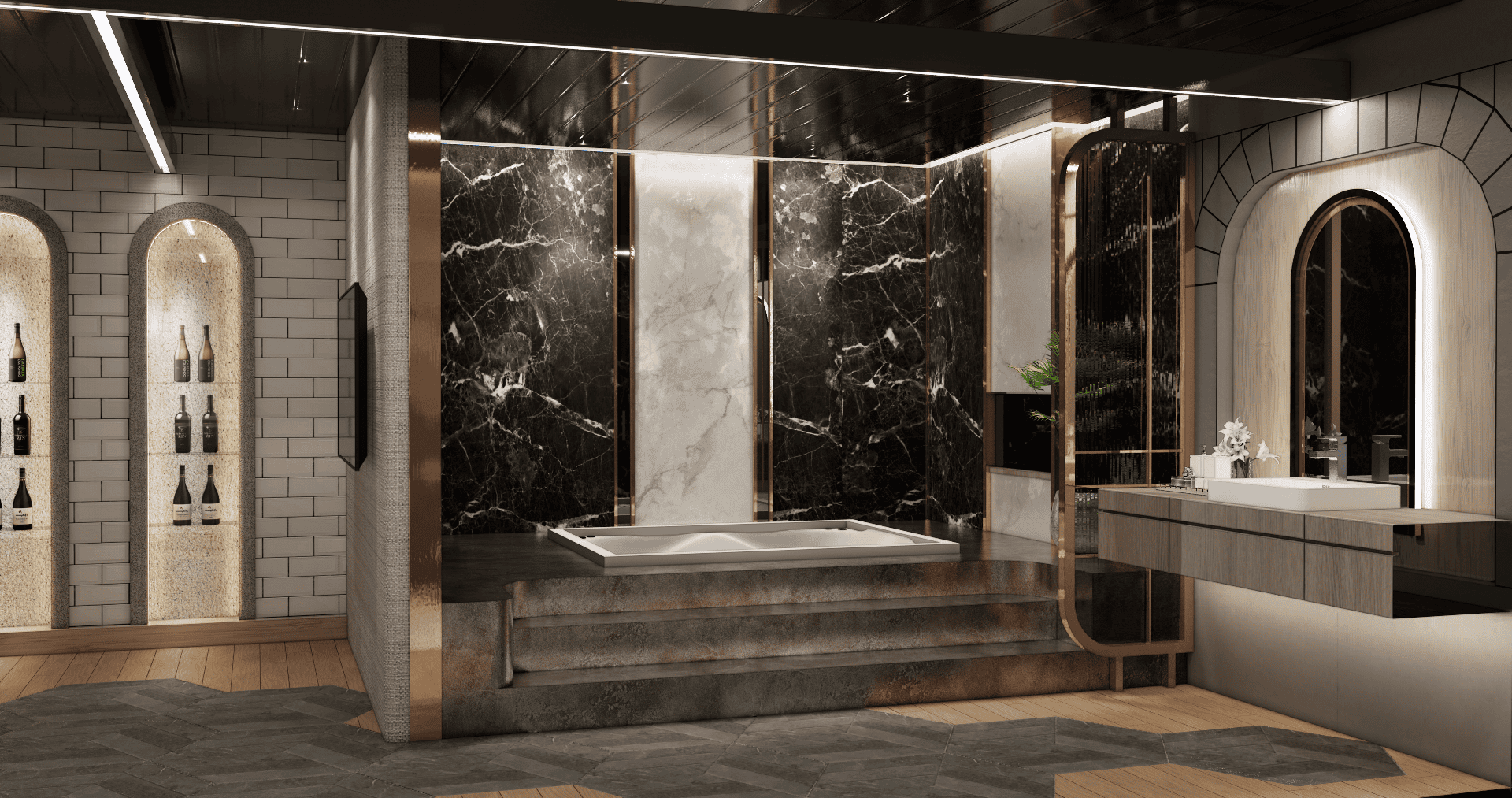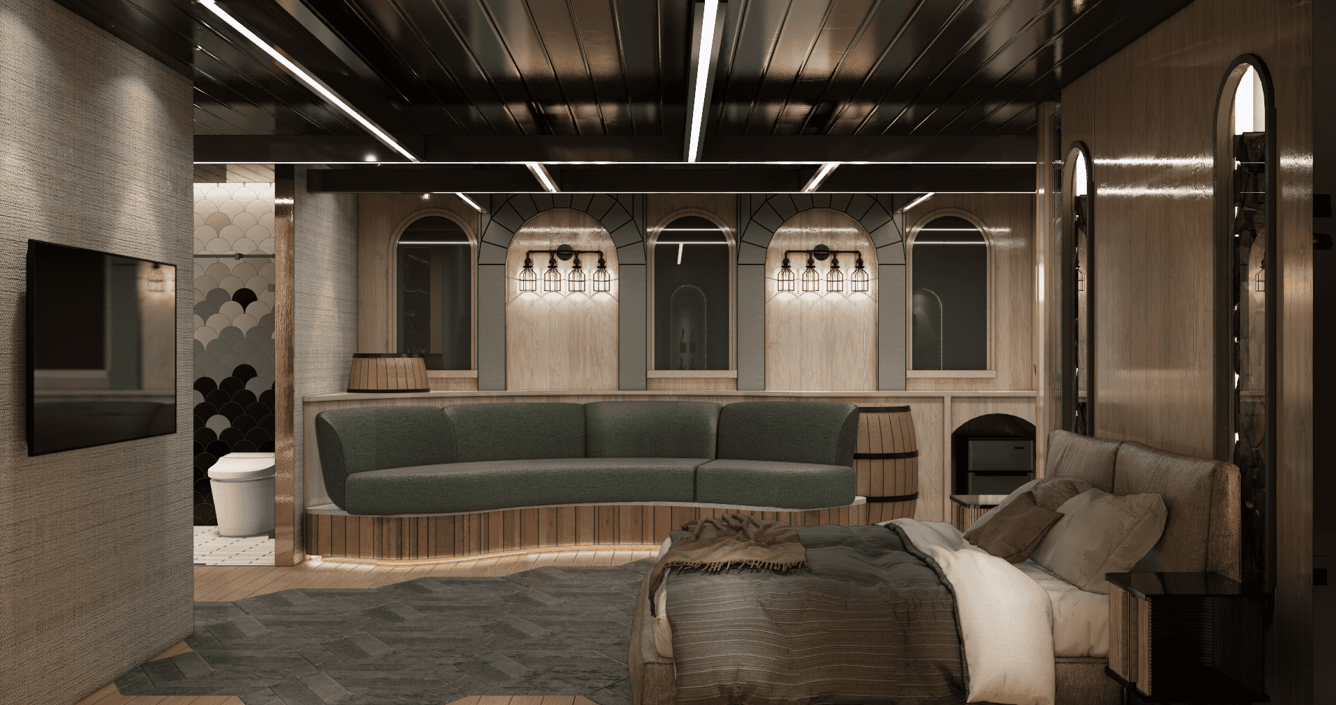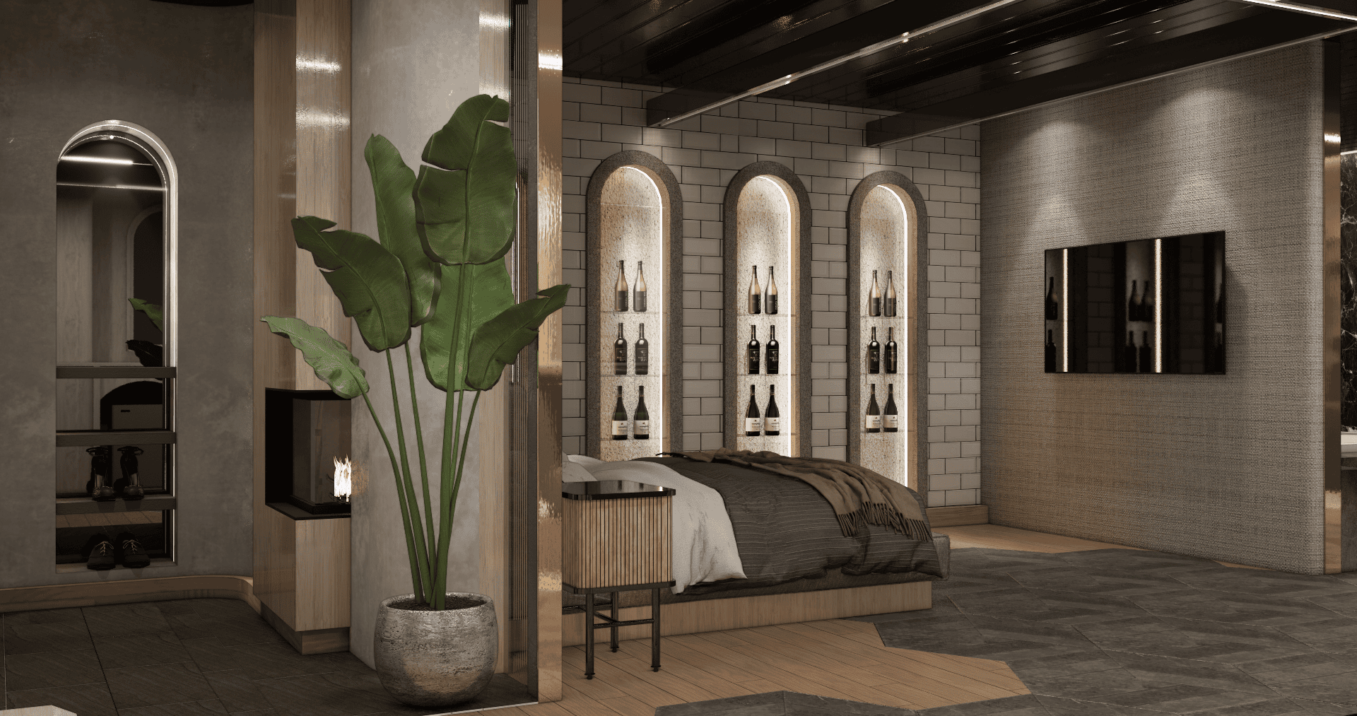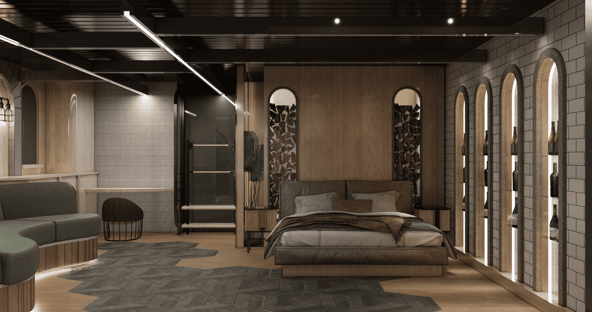 窖藏時刻,如同一處時間的秘境,靜靜收藏著歲月的醞釀與沉澱。於此,每一次停駐,皆是與時光緩緩對話的儀式,讓身心在幽暗且溫潤的氛圍中,沉澱出最純粹的寧靜與深意。踏入房間,映入眼簾的是由層層原木細膩堆疊,透過晶瑩玻璃相隔的床頭主牆。它呼應著前廊壁爐中輕輕燃燒的薪火,將木材溫潤的質感與火焰的暖意,巧妙交織於空間之中,營造出溫婉而富有生命律動的氛圍。房內角落的展示牆,採用雅致拱門層層堆砌,收藏著經年窖藏的佳釀。這不僅是一方靜謐的視覺焦點,更是生活美學的低語,輕柔提醒著旅人於流光中守護心底的從容與喜悅。於窖藏時刻,時間猶如甘醇佳釀,於靜謐中馥郁芳香。每一次停留,都是心靈深處一段細膩且永恆的記憶,邀請您細細品味那份屬於歲月的溫柔與永恆。