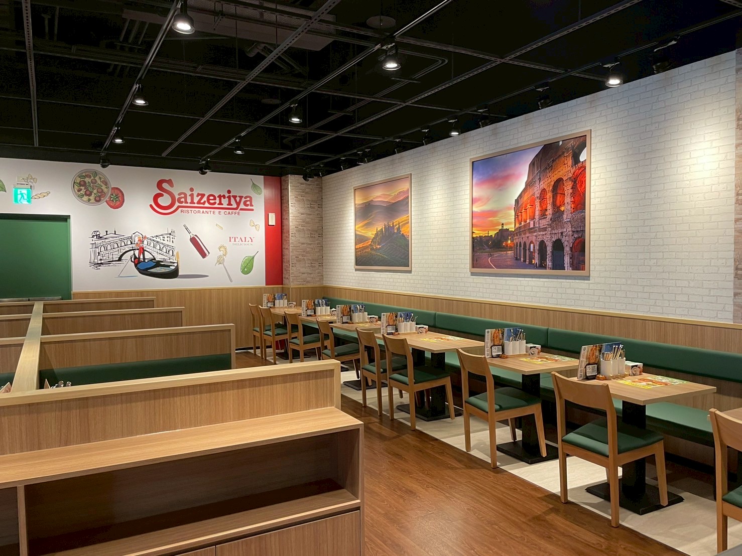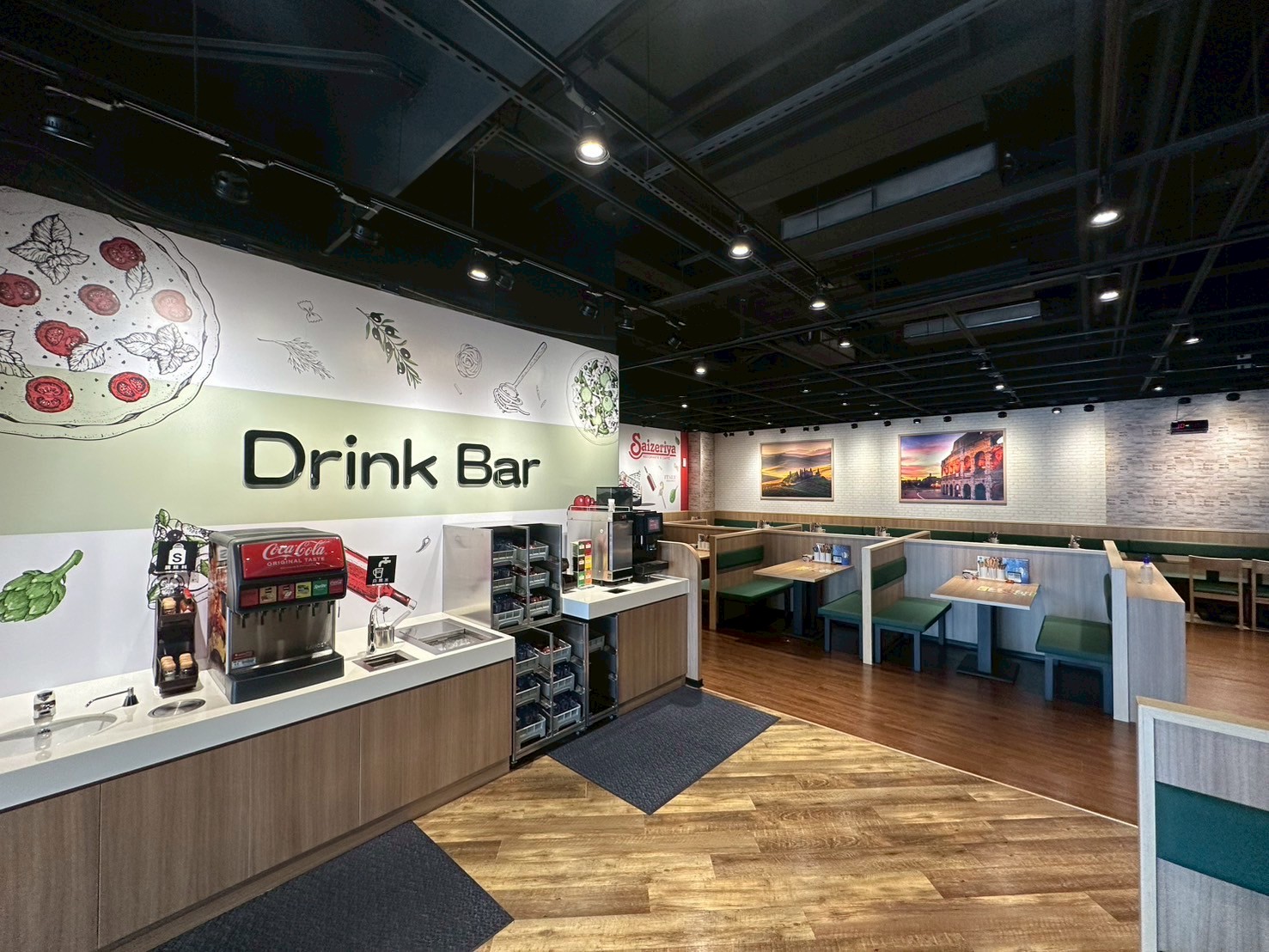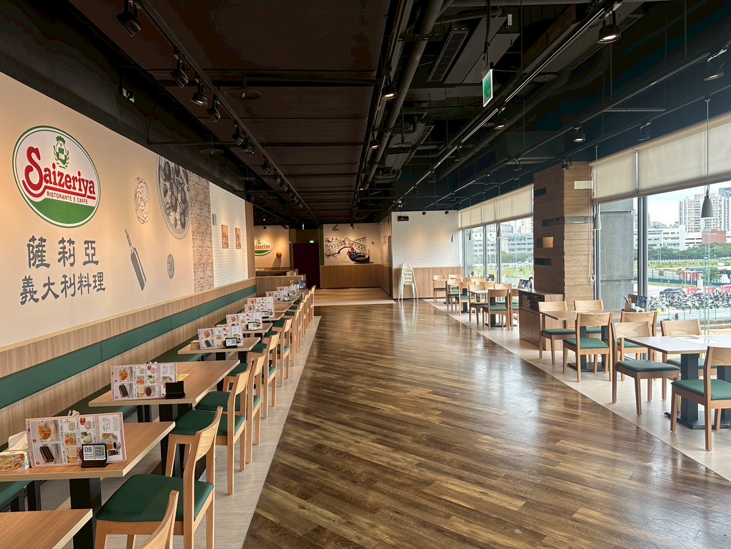 長型配置的用餐空間明亮寬敞,溫潤木質搭配經典綠色座椅,營造出舒適自在的用餐氛圍。大片落地窗引入自然光,城市景緻相伴,讓每一次用餐都多了份輕鬆愜意。部分地板延用,深色木紋地板與新作地板拼接,設計劃分出用餐區域與走道,動線筆直清晰,中央走道寬敞。天花採開放式黑色工業設計,搭配軌道燈與嵌燈,整體視覺開闊,風格呈現現代簡約帶有工業感。牆面設有品牌視覺牆,具有明確識別度與品牌形象。
