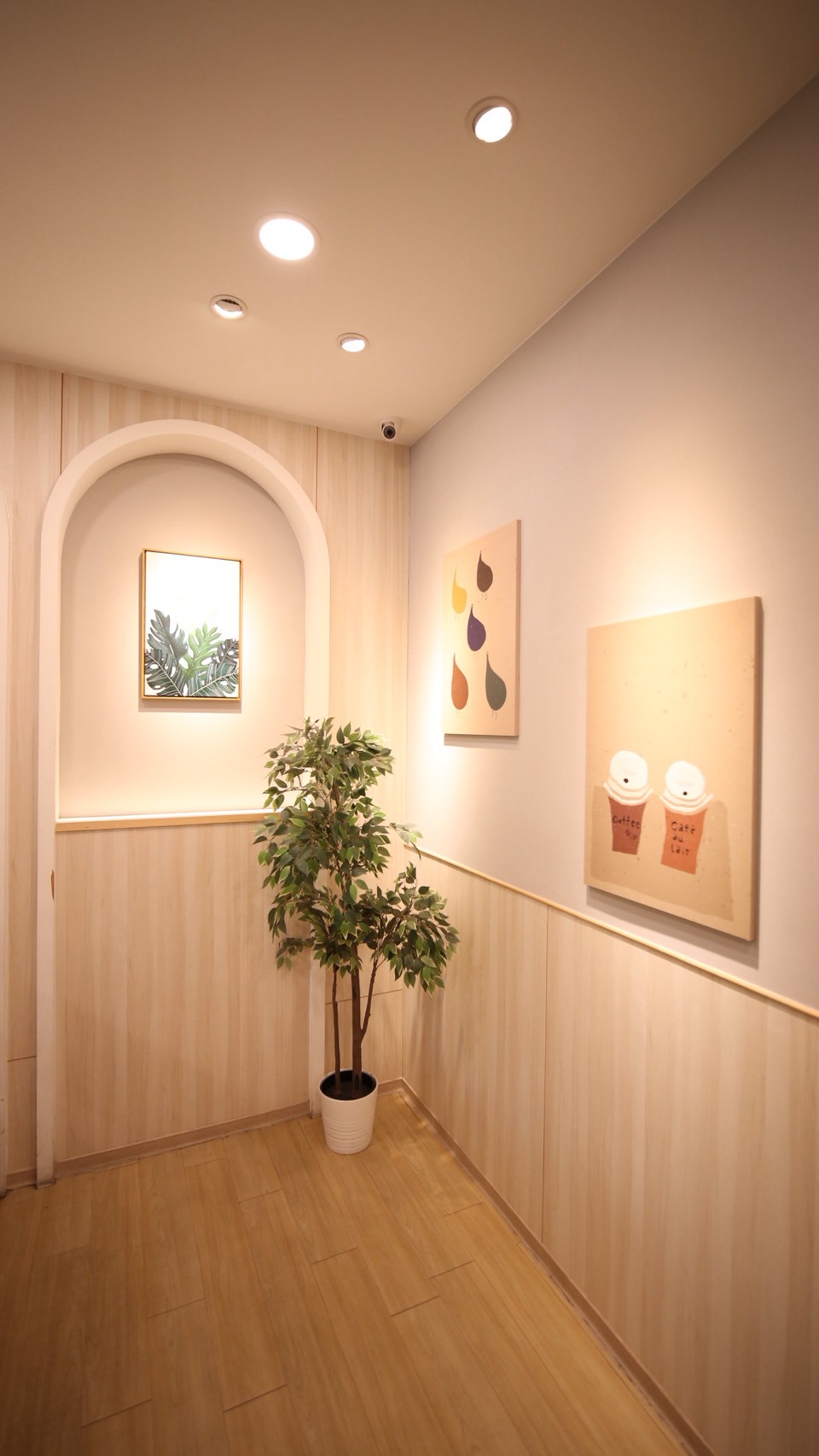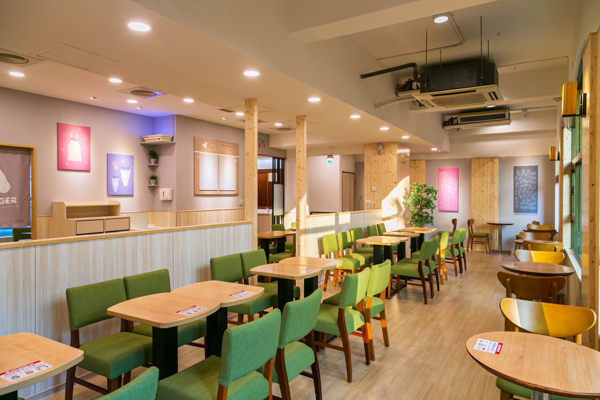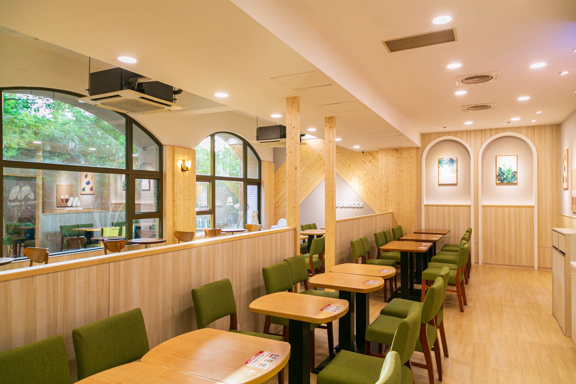空間佈局強調開放感與功能性,座位區保有適當的用餐間距,不僅提升用餐舒 適度,也使整體氛圍更顯悠然。裝飾上穿插綠意植栽,點綴於牆面與轉角之間,為空間注入自然生命力。且不單只是俐落地直線空間布局,圓弧及異材質穿插讓整體更顯清爽且富有層次變化。