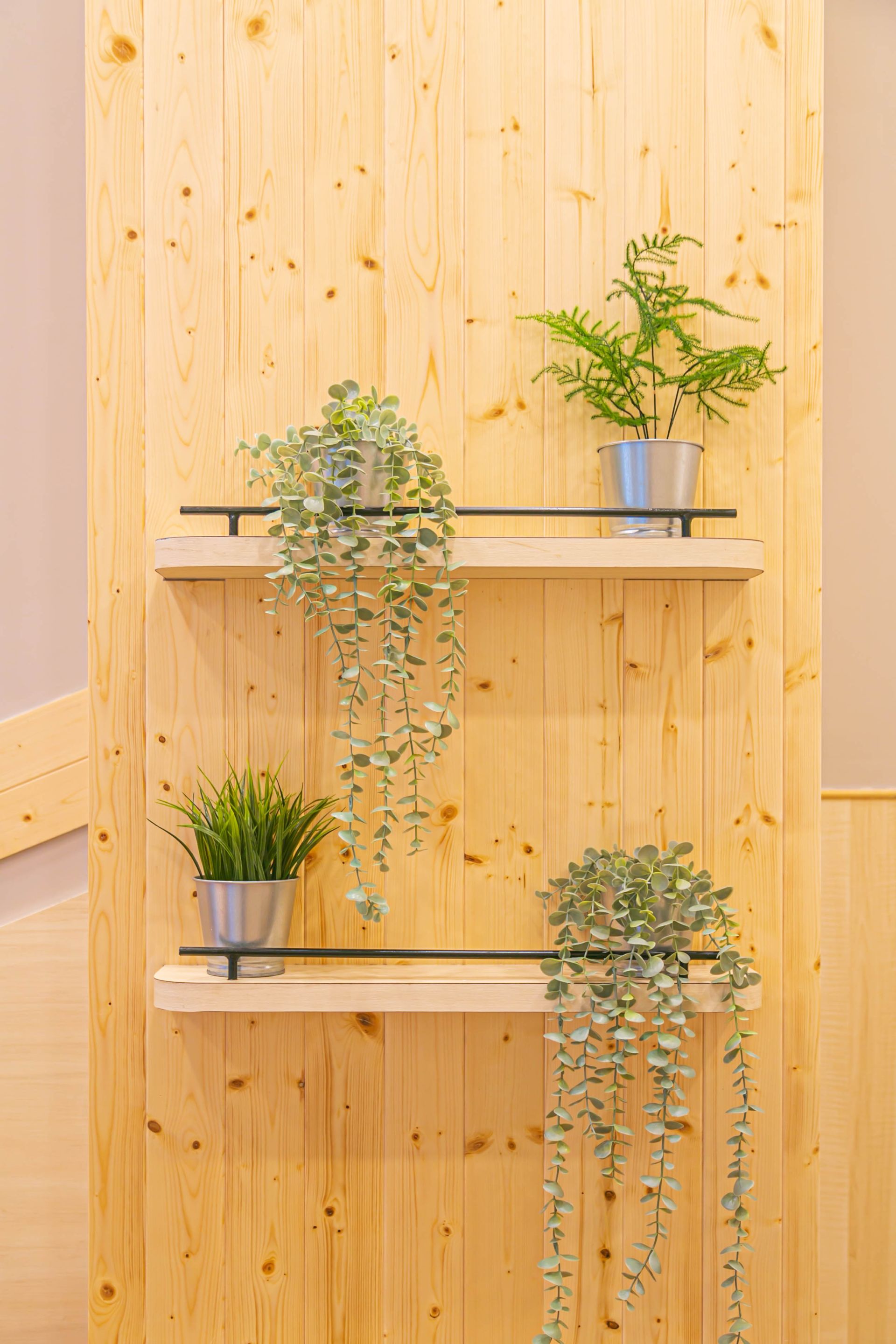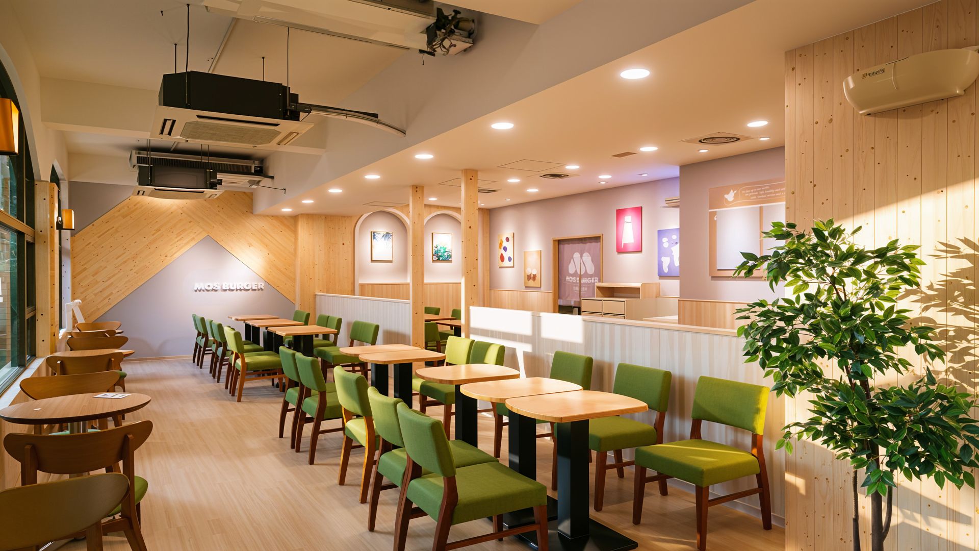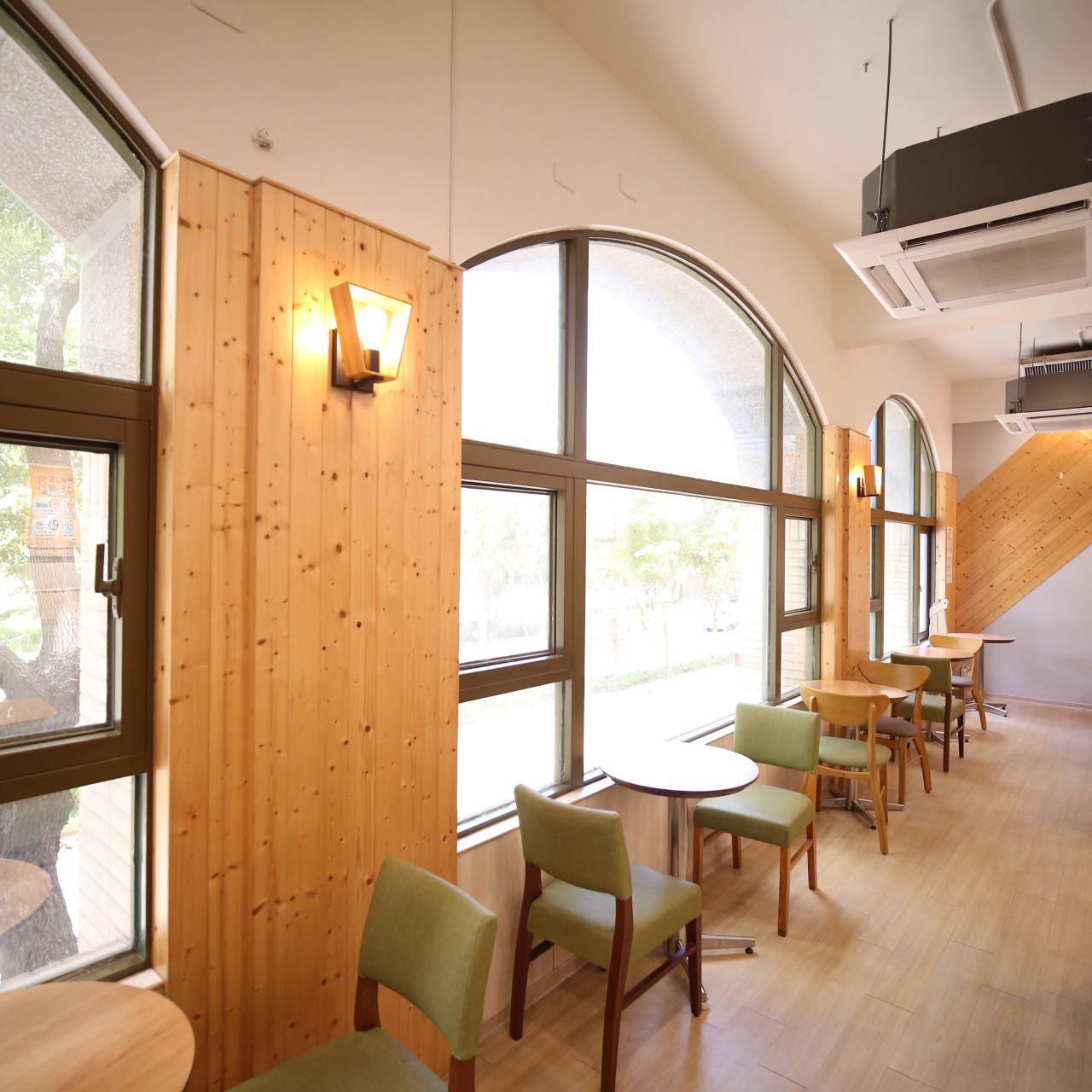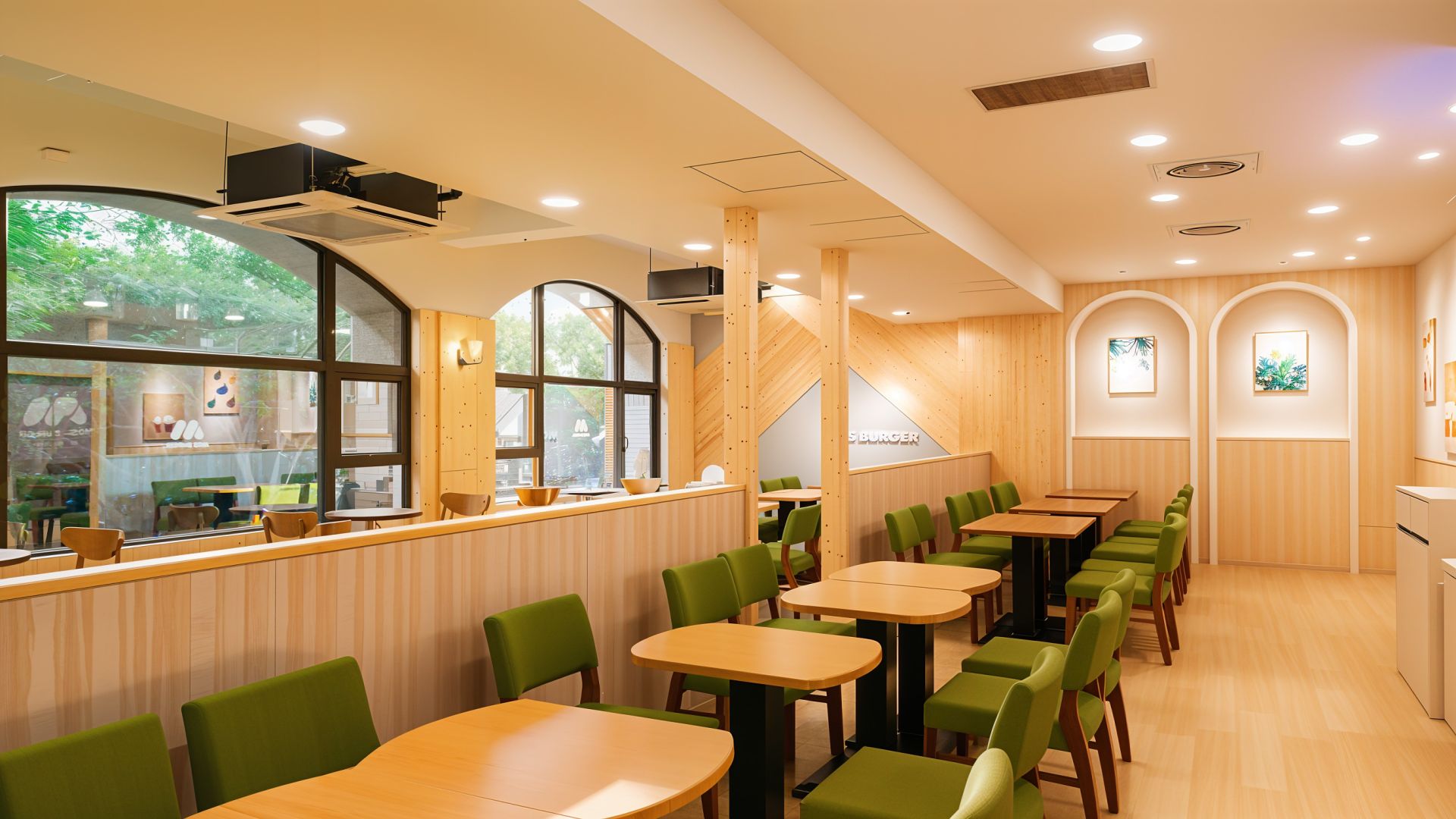 空間佈局強調開放感與功能性,座位區保有適當的用餐間距,不僅提升用餐舒 適度,也使整體氛圍更顯悠然。裝飾上穿插綠意植栽,點綴於牆面與轉角之間,為空間注入自然生命力。且不單只是俐落地直線空間布局,圓弧及異材質穿插讓整體更顯清爽且富有層次變化。