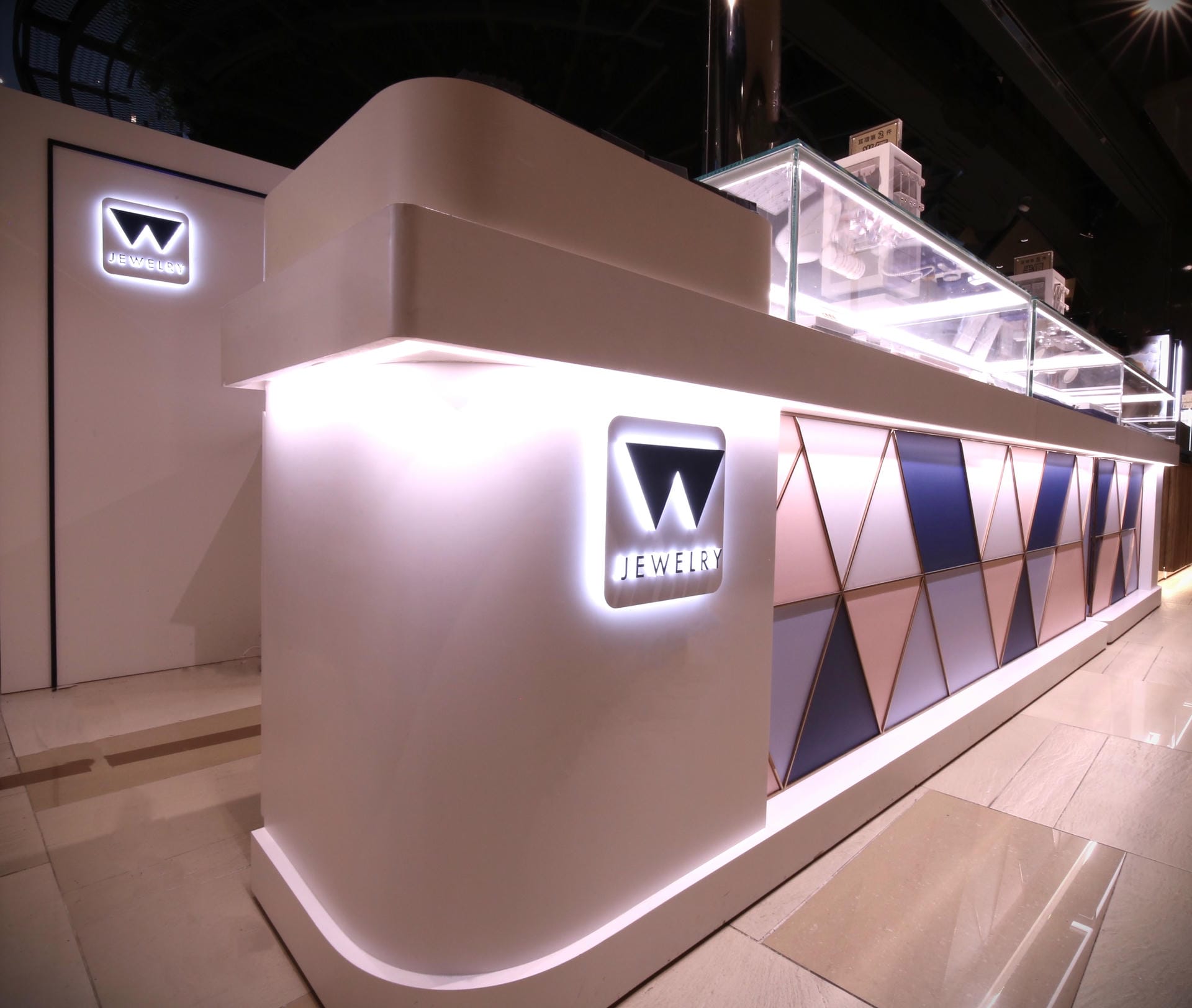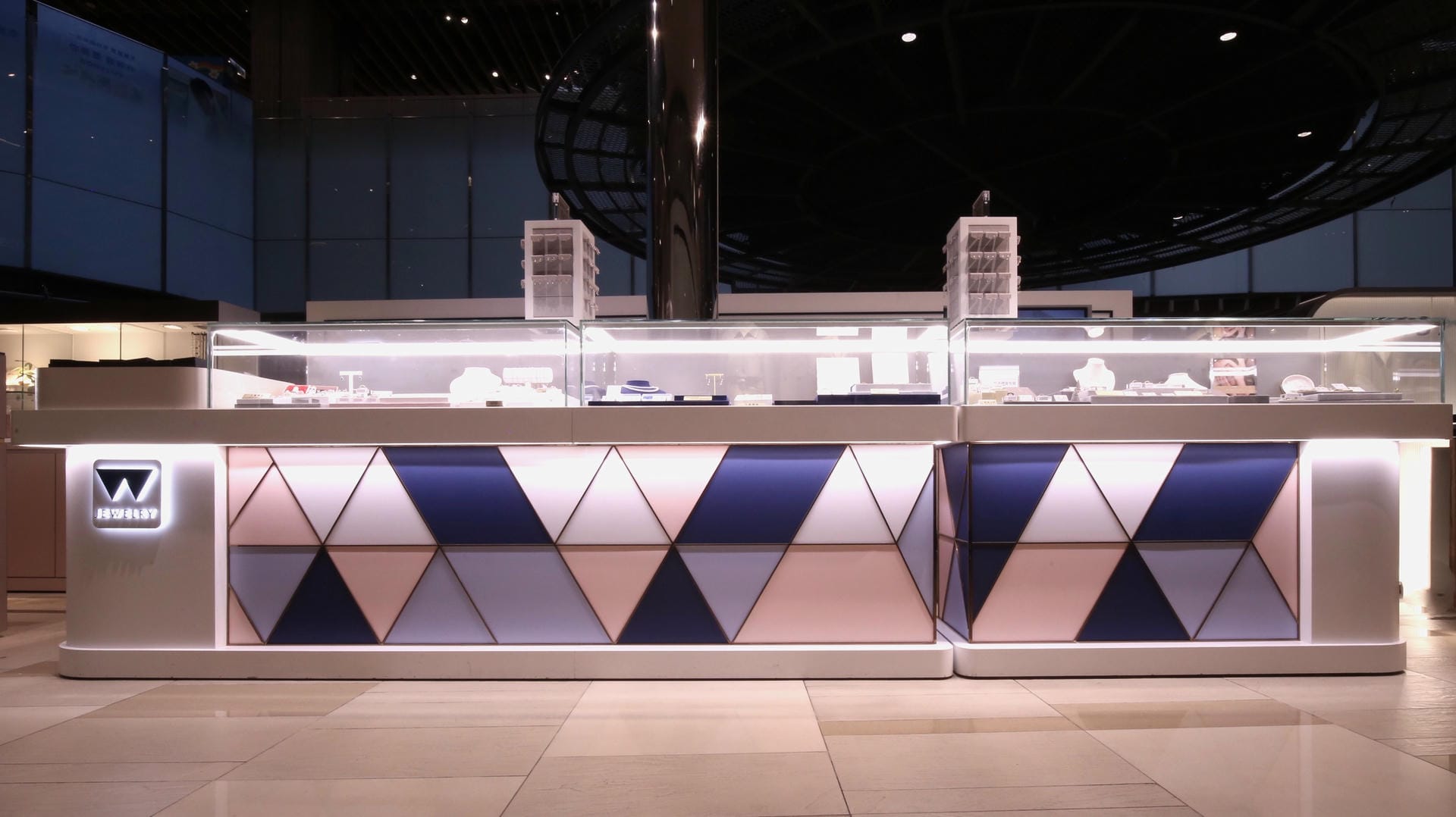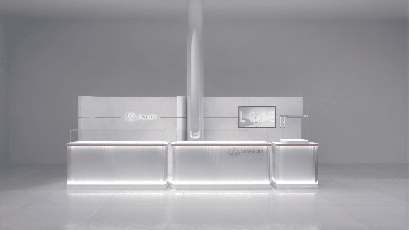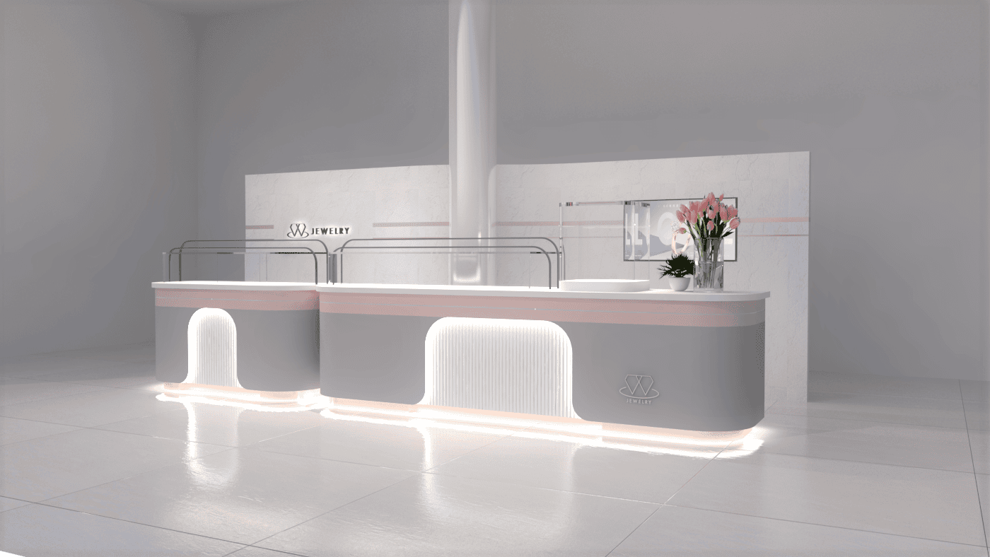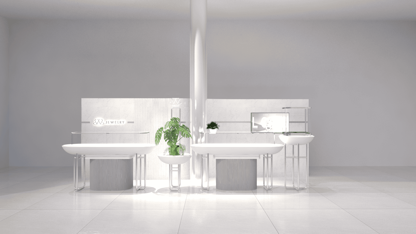 本次展示櫃設計以「船型」為第一階段發想概念,象徵品牌所引進的進口商品來自世界各地,亦傳達出承載與啟航的意象。櫃體支撐結構採用玫瑰金烤漆圓管製作,為整體造型增添一抹低調奢華的金屬質感;船體輪廓結合曲線語彙,使整體造型更具動態與現代感。櫃體背牆則選用仿大理石紋理的美耐板作為主視覺,提升視覺質地與品牌形象。中央以龜背芋植栽作為自然分割與視覺點綴,增添柔和與生氣,也讓陳列空間與綠意互相呼應。第二階段構想則以「通透水晶感」為靈感主軸。整體造型如同一顆剔透璀璨的寶石,主體結構為長虹玻璃柱狀框體,內部透出靛藍漸層彩繪,如同水晶內部的色彩折射,隨著視角變化產生豐富光影效果,成功吸引視覺焦點。內部漸層來自特殊手工漆料繪製,展現出高度工藝美感。桌緣與踢腳部分以玫瑰金金屬鑲邊包覆,提升整體細節質感,形塑優雅而精緻的展示語彙。最終定案版本則以「多面體珠寶切割」為核心語彙,透過三角分割構成呈現如同寶石多面折射般的立體結構。此設計不僅具備強烈的造型感與辨識度,也在機能性上考量模組化組裝的便利性。各個櫃體單元可於固定尺寸中拆解與運輸,提升實際使用與施工效率,同時保有精緻設計的完整呈現。整體設計兼顧品牌象徵、視覺吸引力與實務需求,透過三種構想的演進,最終凝鍊為兼具形象力與靈活度的展示方案,為空間注入強烈的辨識度與美學品味。