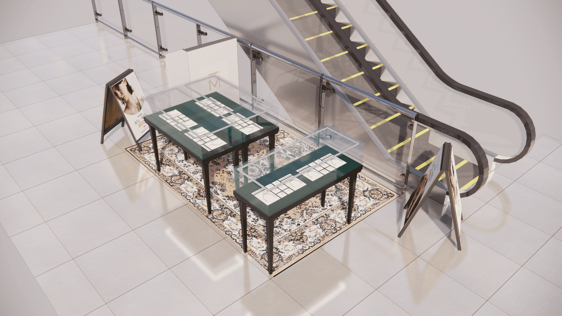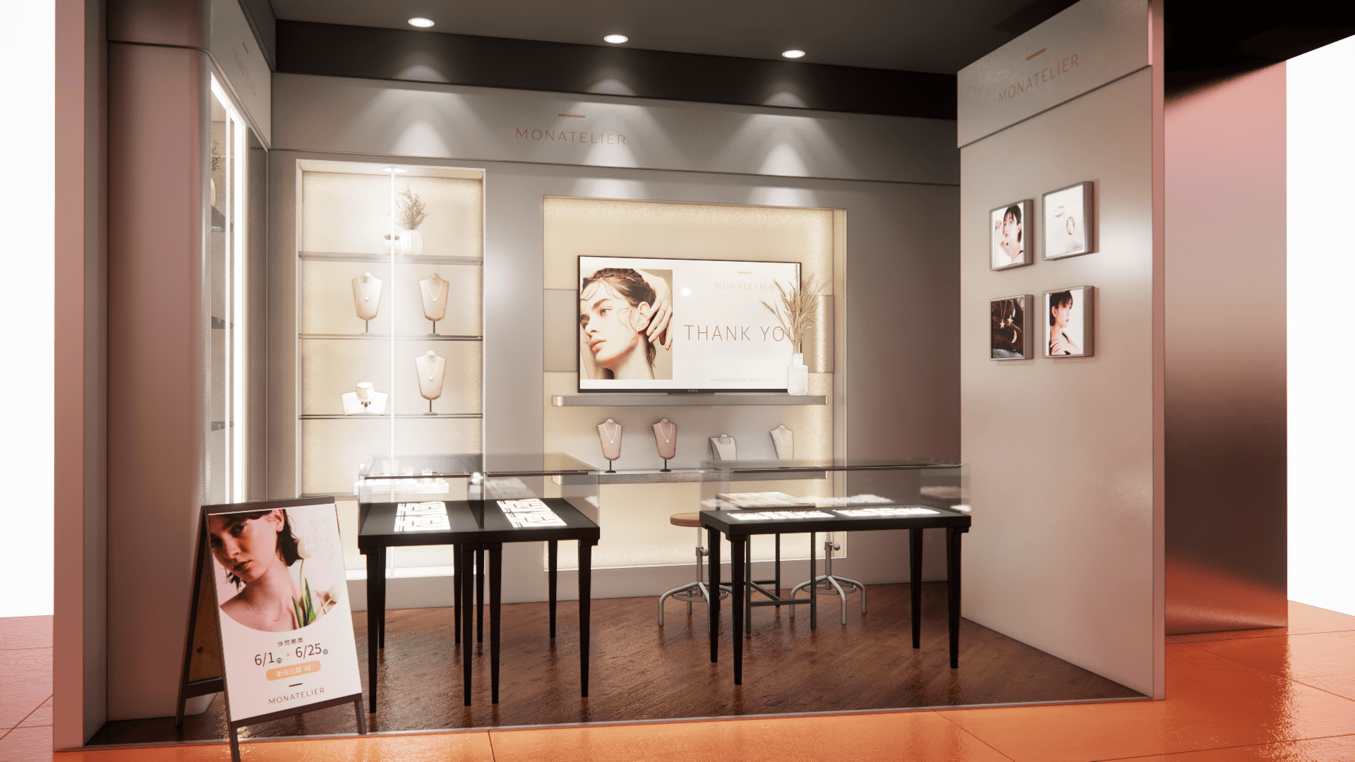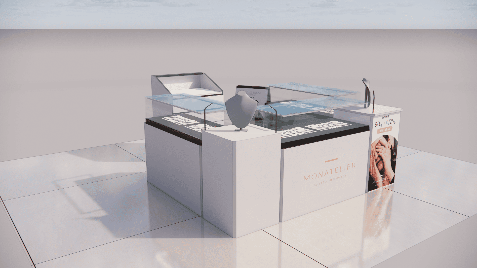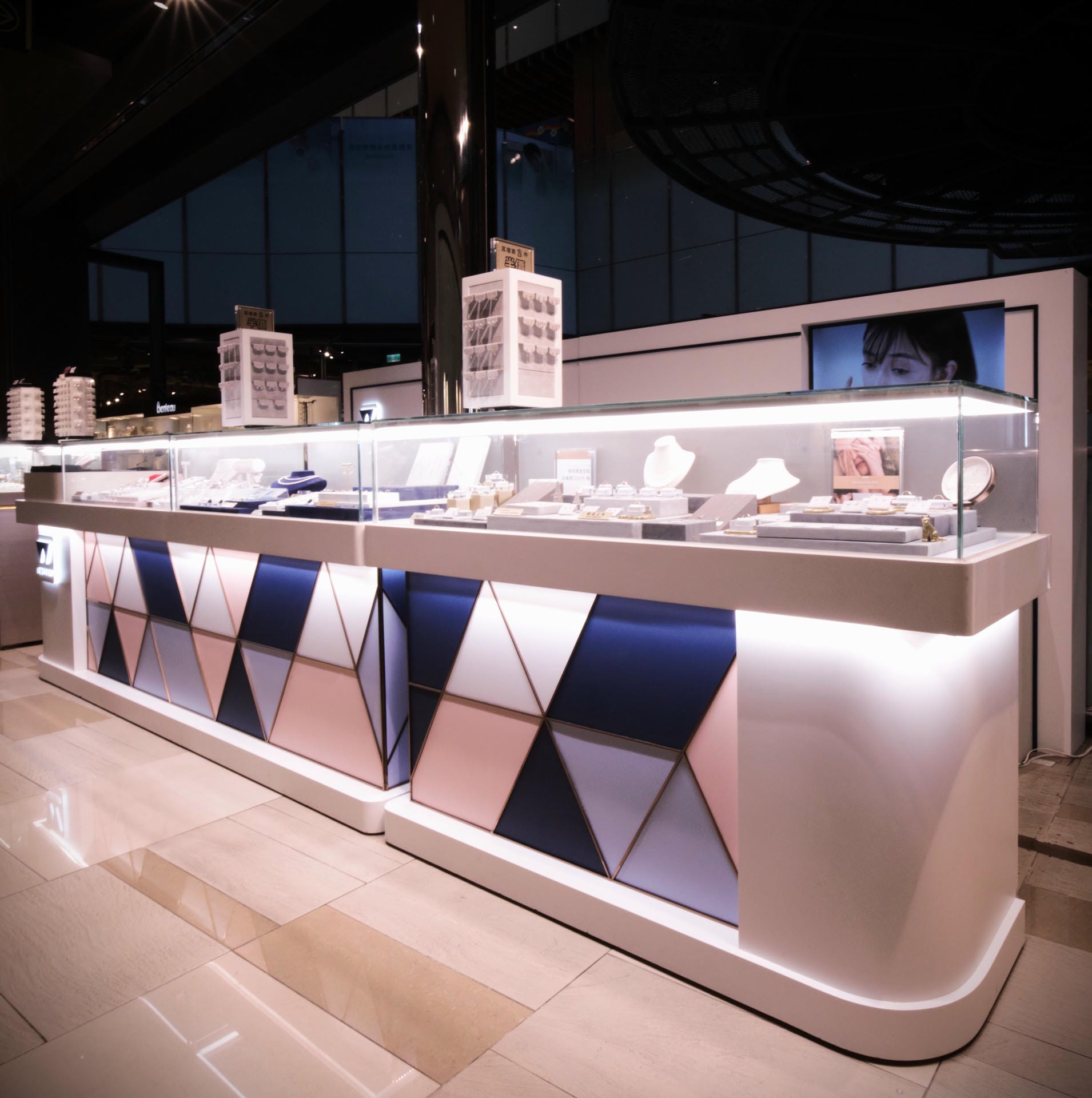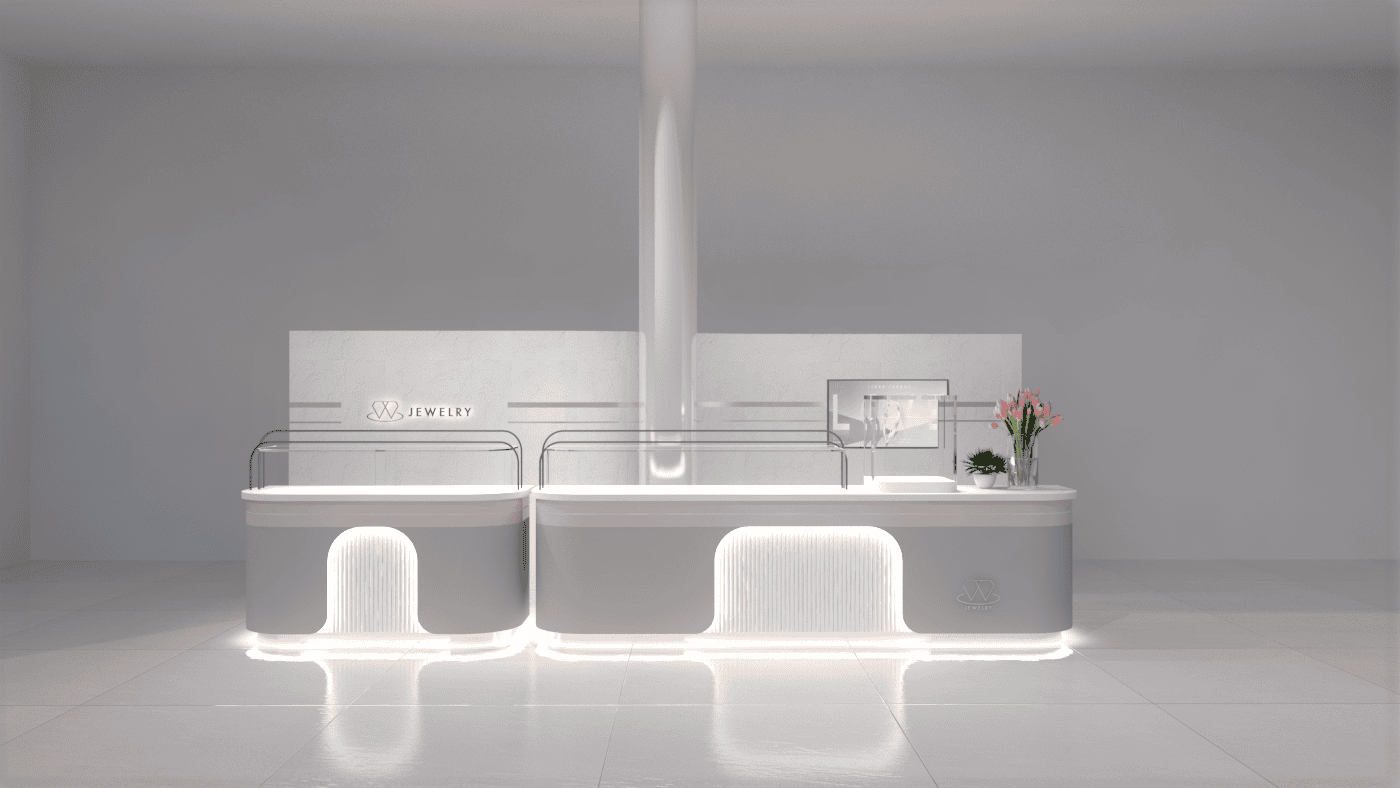 本次展示櫃設計以「船型」為第一階段發想概念,象徵品牌所引進的進口商品來自世界各地,亦傳達出承載與啟航的意象。櫃體支撐結構採用玫瑰金烤漆圓管製作,為整體造型增添一抹低調奢華的金屬質感;船體輪廓結合曲線語彙,使整體造型更具動態與現代感。櫃體背牆則選用仿大理石紋理的美耐板作為主視覺,提升視覺質地與品牌形象。中央以龜背芋植栽作為自然分割與視覺點綴,增添柔和與生氣,也讓陳列空間與綠意互相呼應。第二階段構想則以「通透水晶感」為靈感主軸。整體造型如同一顆剔透璀璨的寶石,主體結構為長虹玻璃柱狀框體,內部透出靛藍漸層彩繪,如同水晶內部的色彩折射,隨著視角變化產生豐富光影效果,成功吸引視覺焦點。內部漸層來自特殊手工漆料繪製,展現出高度工藝美感。桌緣與踢腳部分以玫瑰金金屬鑲邊包覆,提升整體細節質感,形塑優雅而精緻的展示語彙。最終定案版本則以「多面體珠寶切割」為核心語彙,透過三角分割構成呈現如同寶石多面折射般的立體結構。此設計不僅具備強烈的造型感與辨識度,也在機能性上考量模組化組裝的便利性。各個櫃體單元可於固定尺寸中拆解與運輸,提升實際使用與施工效率,同時保有精緻設計的完整呈現。整體設計兼顧品牌象徵、視覺吸引力與實務需求,透過三種構想的演進,最終凝鍊為兼具形象力與靈活度的展示方案,為空間注入強烈的辨識度與美學品味。